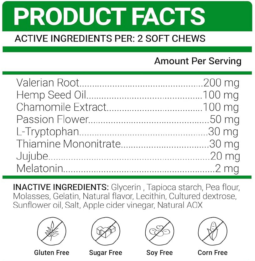 Hemp-based soft chews with chamomile, valerian and jujube to support relaxation and calm behavior. 170 chews, made in the USA.