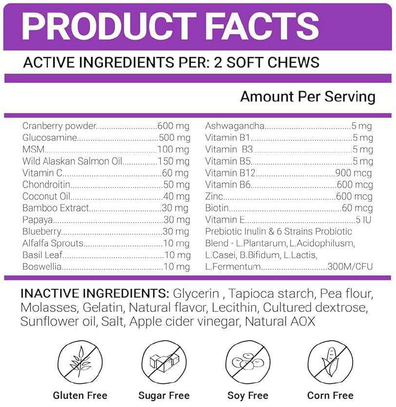 YUMA’S 23-in-1 Dog Multivitamin Chews deliver a carefully balanced blend of nutrients that help support your dog’s vitality from nose to tail. Each chew combines glucosamine, probiotics, and omega-3 fatty acids with a rich mix of natural ingredients — including cranberry powder, MSM, wild Alaskan salmon oil, vitamin C, chondroitin, coconut oil, bamboo extract, papaya, blueberry, alfalfa sprouts, basil leaf, boswellia, ashwagandha, zinc, biotin, and essential B-vitamins (B1, B2, B3, B5, B6, B12).