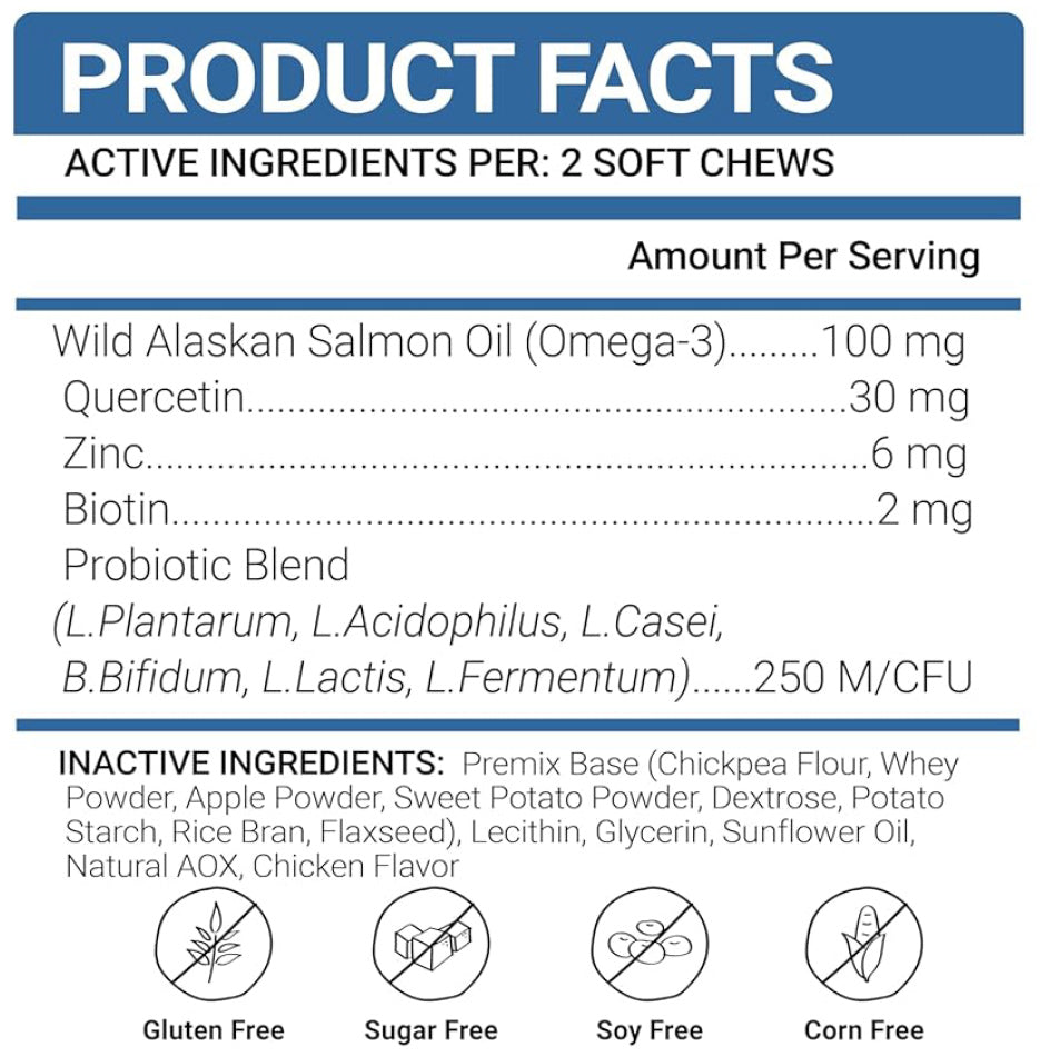 What’s inside. Wild Alaskan salmon oil (EPA & DHA), flaxseed oil, biotin, zinc, and quercetin—ingredients chosen to help maintain skin hydration, reduce excess shedding, and keep coats soft and shiny over time.